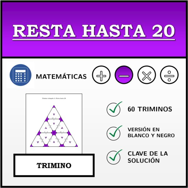 El material contiene un total de 60 conjuntos de Trimino (actividades matemáticas) sobre el tema resta hasta 20, distribuidos de la siguiente manera: