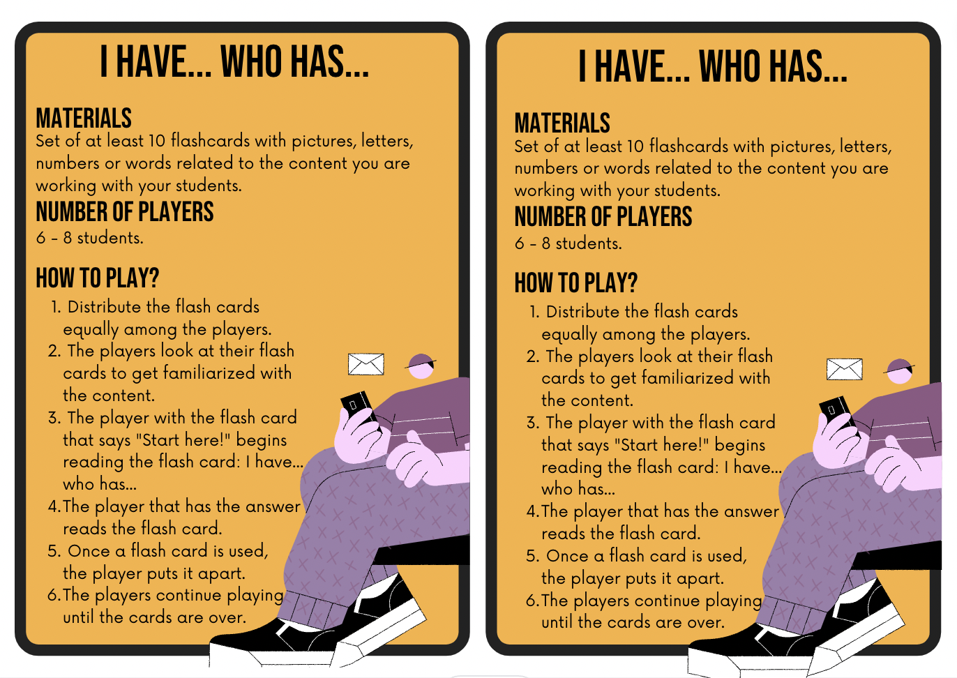 This resource includes 17 flashcards to practice playing the game I have… Who has…